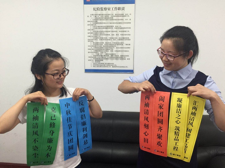 “凝廉潔之心,筑精品工程;匯兩袖清風,樹建工品質(zhì)?!敝抵星铩鴳c雙節(jié)來臨之際,連云港市城建控股建工集團為深入貫徹落實中央八項規(guī)定精神,切實將《連云港市深化機關作風八項禁令》要求落到實處,多措并舉,組織系列創(chuàng)新活動,巧借雙節(jié)促“廉潔”。