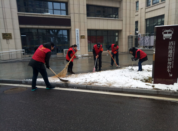 盡管天氣寒冷,空中還飄著小雪,但大家熱情卻很高漲,依次對社區(qū)、街道的地上停車場及小區(qū)花園的積雪進(jìn)行清掃。志愿者們分工協(xié)作,配合有序,有鏟的、有掃的、有推的,都希望能在社區(qū)業(yè)主出行高峰期前盡快清理完畢。志愿者們忙碌的紅色身影,成了雪中一條最美麗的風(fēng)景線,經(jīng)過他們1個多小時的辛勤勞動,積雪的清掃工作順利結(jié)束。