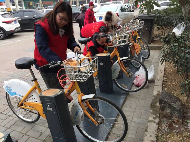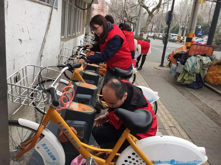 10多名志愿者在南極北路上手拿抹布, 仔細地將共享單車的車身、車鎖、底板進行清潔。盡管天氣還有點寒冷,但是黨員志愿者們不喊苦、不叫累,手放在冷水桶里淘洗抹布,干勁十足,短短一個小時共整理清潔近50輛。除了公共自行車之外,各站點的車樁也被納入了擦洗范圍。路上的市民對參與活動的志愿者們紛紛豎起大拇指,連連稱贊!