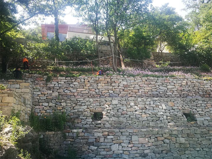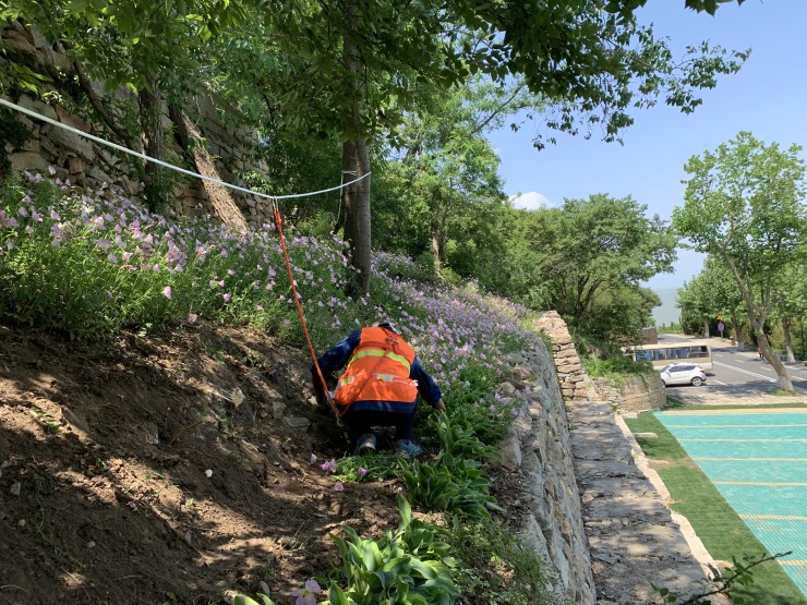 由于現(xiàn)場(chǎng)山體地勢(shì)復(fù)雜,苗木栽植于陡坡上,栽植前需要人工對(duì)陡坡進(jìn)行土壤翻耕,翻耕過程中還需防備山體內(nèi)碎石滑落對(duì)人員造成傷害。同時(shí)施工區(qū)域內(nèi)雜草叢生且有毒性的蛇蟲出沒,給施工帶來很多不確定因素。金海園林項(xiàng)目部克服困難,做好前期的安全技術(shù)交底工作,并安排專職人員在現(xiàn)場(chǎng)進(jìn)行安全施工管理,穩(wěn)步推進(jìn)項(xiàng)目施工進(jìn)度。