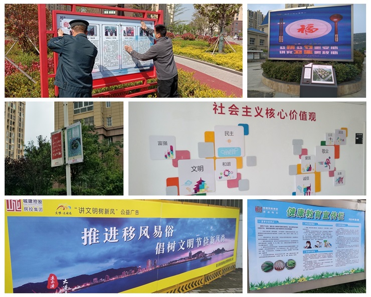 營造氛圍,做好長效宣傳。各物管處結合實際,利用宣傳橫幅、LED顯示屏和戶外宣傳欄等載體廣泛宣傳社會主義價值觀、孝老愛親、綠色生活等公益廣告;開設健康教育專欄,多方位、多角度宣傳創(chuàng)文創(chuàng)衛(wèi)及科學防疫知識。各項目點更換安裝宣傳牌共計800余塊。營造了濃厚的創(chuàng)文宣傳氛圍,有效提升居民群眾對創(chuàng)文工作的知曉率和滿意度。