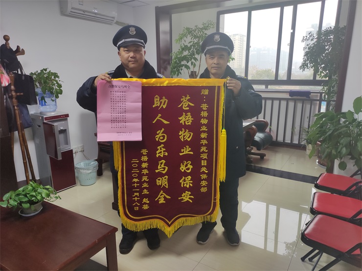 11月26日下午,蒼梧物業(yè)新華苑項(xiàng)目處收到了業(yè)主趙女士送來(lái)的一面錦旗,“蒼梧物業(yè)好保安,助人為樂(lè)馬明全”幾個(gè)大字格外顯眼。