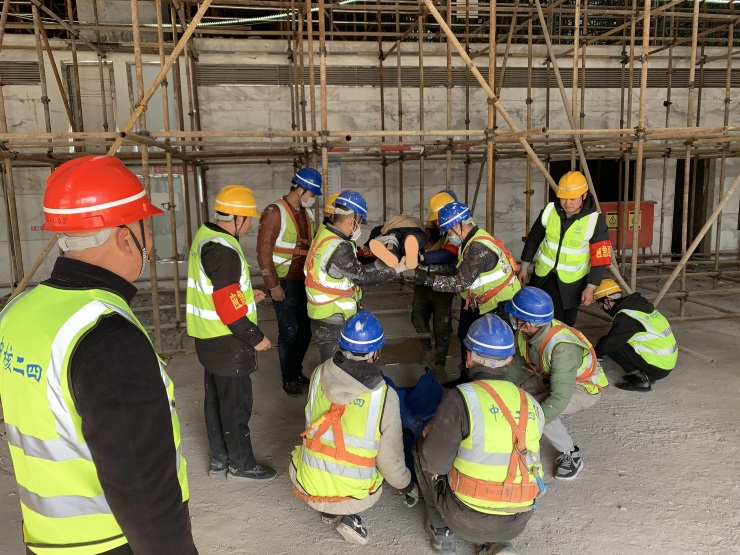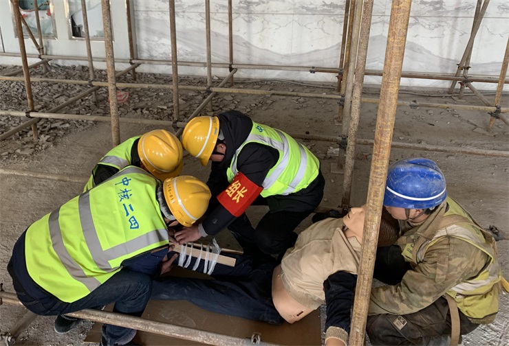 演練模擬現(xiàn)場,一名高處施工作業(yè)人員在施工過程中不慎從平臺上墜落,造成腿部受傷。在接到通知后,應(yīng)急救援領(lǐng)導(dǎo)小組第一時間啟動《高空墜落事故應(yīng)急預(yù)案》,項(xiàng)目部施工班長首先上報事故發(fā)生地點(diǎn),隨后金海岸安監(jiān)部負(fù)責(zé)人迅速作出救援指示?,F(xiàn)場物資保障組、應(yīng)急搶救組、警戒疏散組、應(yīng)急醫(yī)療救護(hù)組緊急集合,按照應(yīng)急預(yù)案迅速開展救援。演練中,人員配合默契,整個過程緊張有序,最終按照既定程序順利完成,達(dá)到了預(yù)期效果。